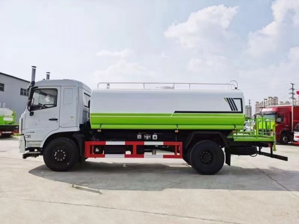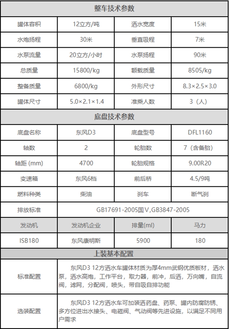 國六東風D3系列12-15方灑水車,底盤型號:DFV1163GP6DJ, 陜齒小八檔(8JS85E),發動機采用康機D4.0NS6B195 (4缸發動機),國六排放,前橋2.8T,后橋8T,9.00鋼絲胎(9.00R20)ABS,原廠空調、氣 囊座椅、多功能方向盤、MP5、行車記錄儀、中控門鎖帶遙控鑰匙。上裝:罐體采用標準Q235 碳鋼制作,罐體自動焊,配大功率專用灑水車,可自吸自排,前沖后灑,側噴,高位花灑,主 管道加粗,大通徑球閥,直通球閥式消防接口,帶后工作平臺,沖孔平臺,帶高炮。