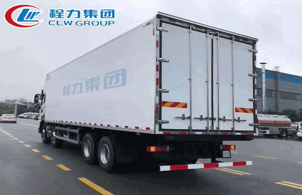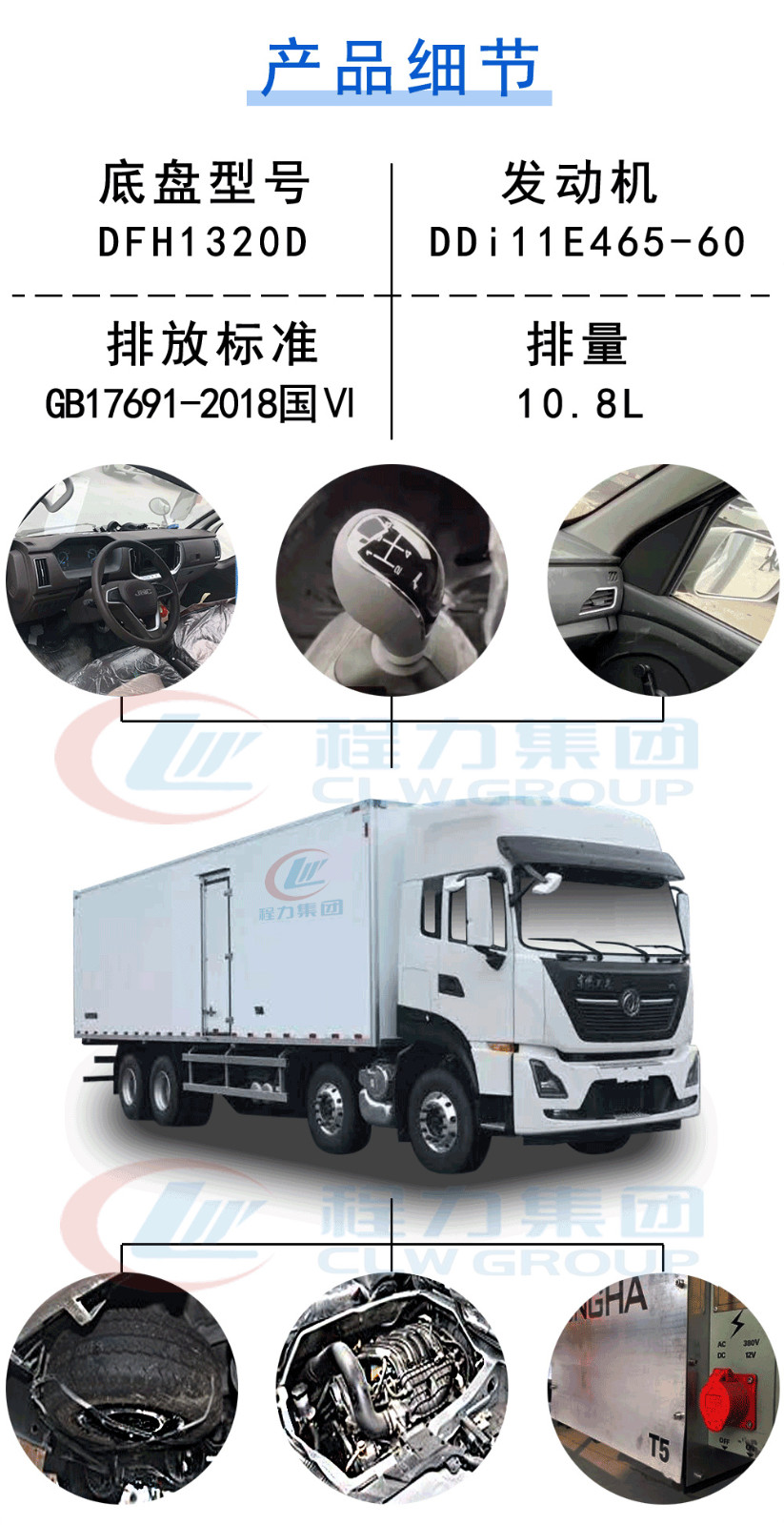 | 其他 | 隨底盤選裝僅高度不同的駕駛室,高頂駕駛室頂部氣喇叭為選裝件,駕駛室前角擾流板為選裝件,選裝單油箱或雙油箱;貨廂選裝單開門,雙開門和不開門型式;選裝其它廠家功率相當(dāng)?shù)闹评錂C(jī)組,選裝前置式,內(nèi)置式,底置式制冷機(jī)組;選裝升降尾板,尾板收起狀態(tài)時(shí)的水平長(zhǎng)度為295mm;廂體頂部封閉,不可開啟;側(cè)防護(hù):材料Q235,螺栓連接;后下防護(hù):材質(zhì)Q235.螺栓連接,斷面尺寸120×60mm,離地高度460mm;安裝具有衛(wèi)星定位功能的行駛記錄儀;裝有ABS,ABS型號(hào)/生產(chǎn)廠家:ABS 8/東科克諾爾商用車制動(dòng)系統(tǒng)(十堰)有限公司;發(fā)動(dòng)機(jī)DDi11E465-60對(duì)應(yīng)油耗申報(bào)值37.1L/100km. | ||